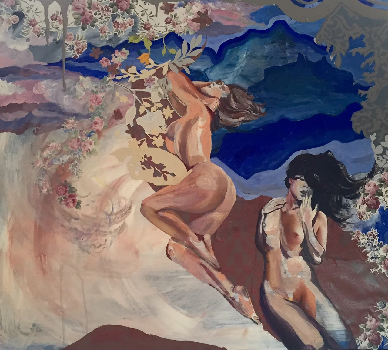 My process begins by creating a very painterly and luscious background. This is the fun part. I get messy and just go with it. I use everything from spray paint, watercolor, wallpaper patterns, graphite, and acrylic. Then I begin to add the female figure to the composition. I always sketch it out first. Then I will add elements of cut out skin tones as collage or ink, or paint to the body. When I am working on a painting I make very deliberate marks. Each brush stroke is thought out before hand.